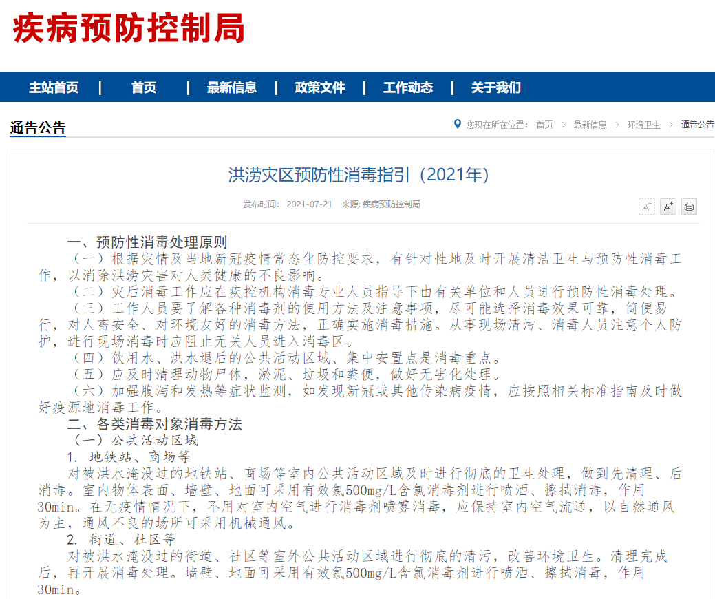 国家卫健委21日发布洪涝灾区预防性消毒指引。其中提到,对被洪水淹没过的地铁站、商场等室内公共活动区域及时进行彻底的卫生处理,做到先清理、后消毒。室内物体表面、墙壁、地面可采用有效氯500mg/L含氯消毒剂进行喷洒、擦拭消毒,作用30min。在无疫情情况下,不用对室内空气进行消毒剂喷雾消毒,应保持室内空气流通,以自然通风为主,通风不良的场所可采用机械通风。